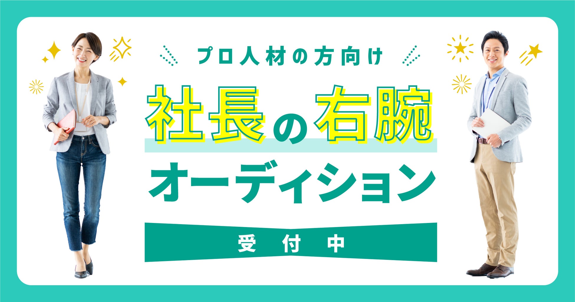 「中小・ベンチャー企業の“社長の右腕”として貢献できるプロ人材の方」を対象に、「社長の右腕オーディション」を実施中です。このオーディションにご参加いただくことにより、「社長の右腕」を必要としている中小・ベンチャー企業とのマッチング可能性がより高まります。ぜひ、ご参加ください。