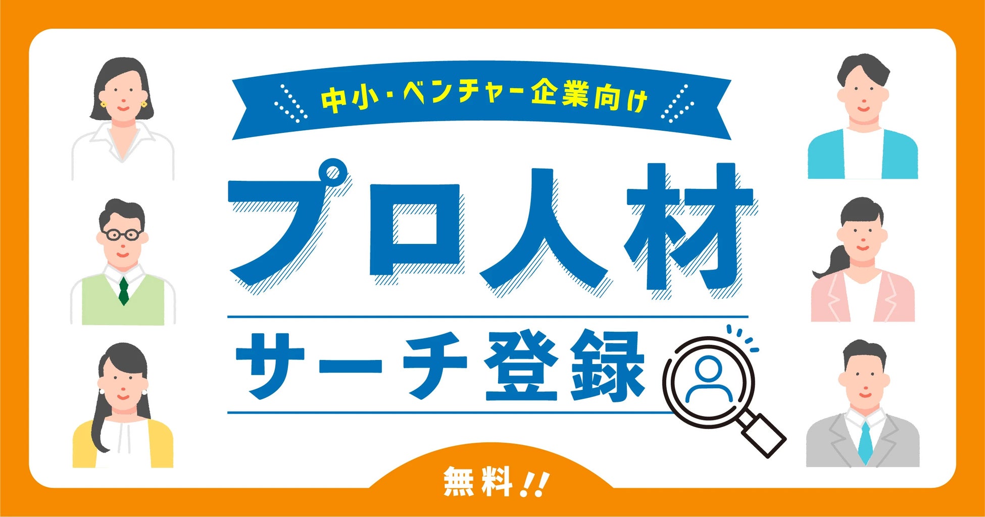 「社長の右腕」として貢献できるプロ人材を必要としている中小・ベンチャー企業を対象に、「プロ人材サーチ登録」を受付中です。「プロ人材サーチ登録」とは、「プロ人材サーチ登録フォーム」より、貴社が求めるプロ人材の要件をご登録いただくと、それに合致するプロ人材を当社が探し出し、見つかり次第、ご提案・ご紹介させていただく、というサービスです。登録は無料ですので、ぜひご利用ください。
