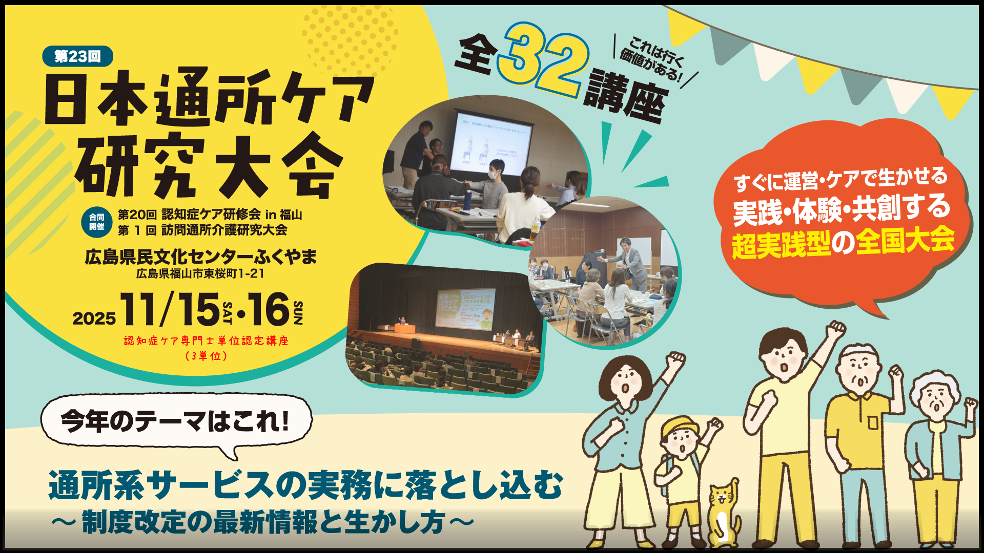 後援(順不同):福山市、広島県介護福祉士会、全国デイ・ケア協会、日本理学療法士協会、日本認知症ケア学会ほか