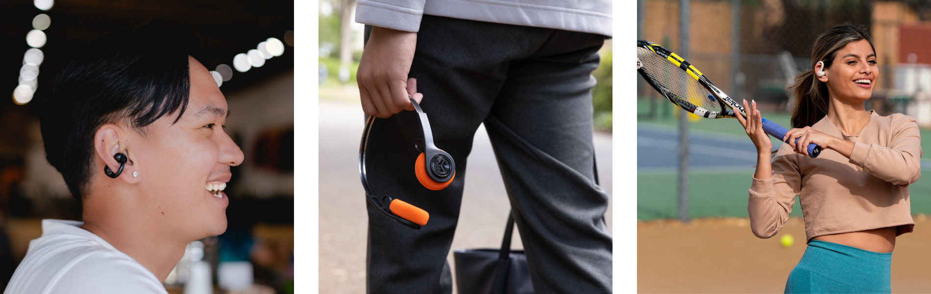 耳をふさがないイヤーカフ型イヤホンや、耳掛けタイプのスポーツイヤホンなど、様々なシーンで活躍する製品を手に取っていただけます。