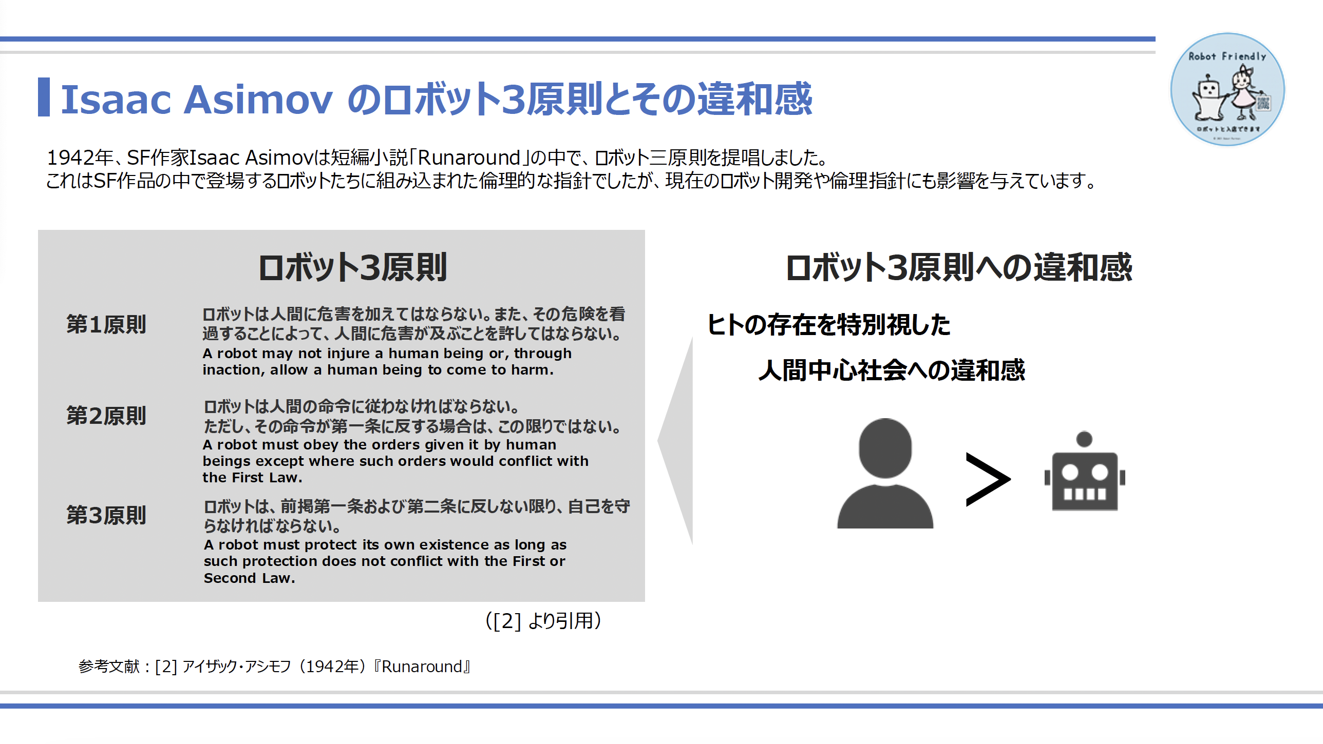 新ロボット3原則 〜Robot Friendlyな社会の実現に向けて〜 New Three Laws of Robots (こちらからダウンロードいただけます) https://www.slideshare.net/slideshow/3-robot-friendly-new-three-laws-of-robots-to-prepare-for-the-robot-friendly-society-2e9e/283525703