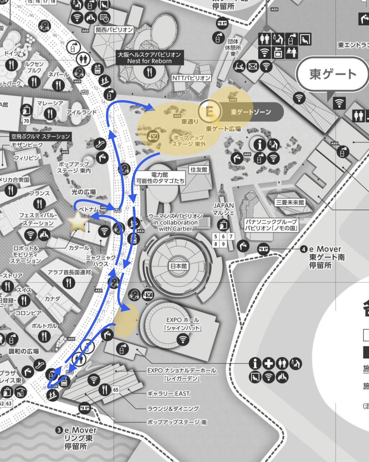 おさんぽルートは、大阪・関西万博(夢洲)会場内の「ROBOT&MOBILITY STATION(ロボット&モビリティステーション)」を出発し、東ゲート広場、シャインハット前、大屋根リング下を通り、ROBOT&MOBILITY STATIONに戻ります(雨天中止)。