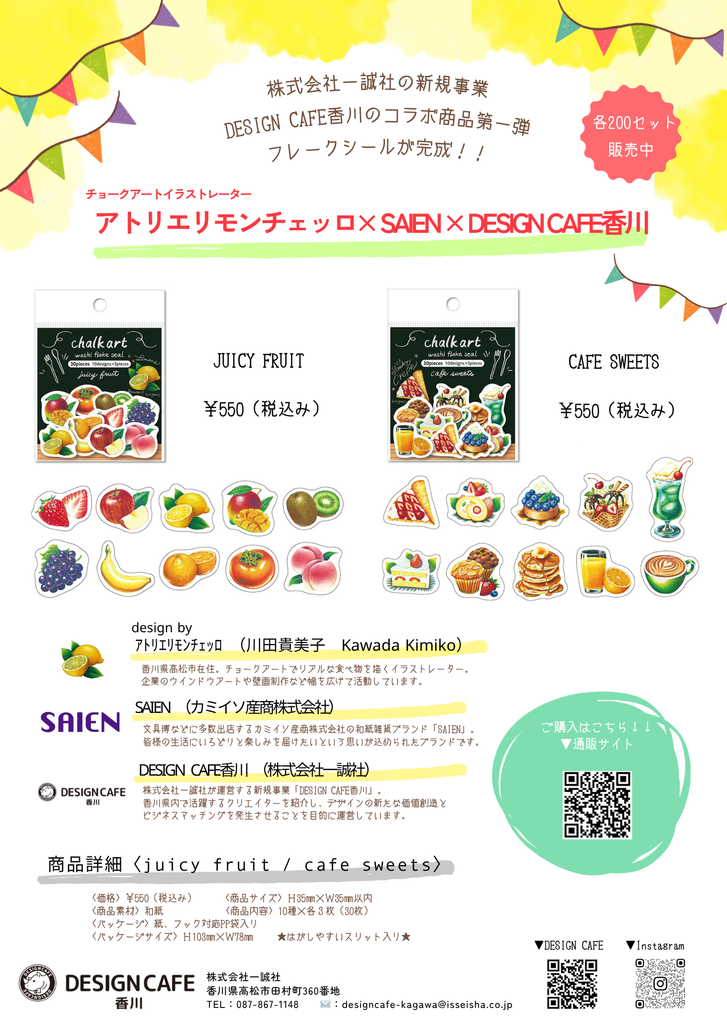 第1弾は既に販売開始しておりますチョークアートイラストレーター「アトリエリモンチェッロ」様のフレークシールで、こちらもSAIEN(カミイソ産商株式会社)とDESIGN CAFE香川(株式会社一誠社)のコラボ商品です。