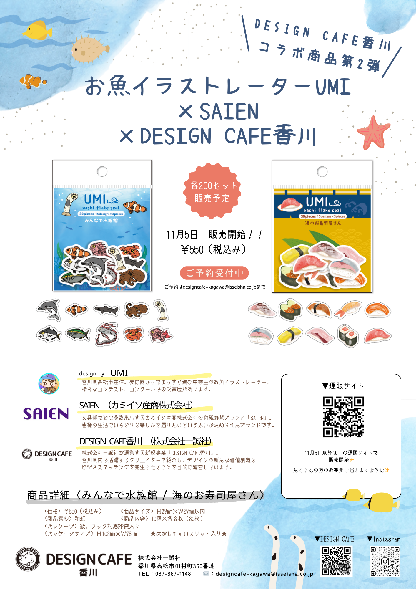 香川県で活躍するクリエイター様を集めたポータルサイト「DESIGN CAFE香川」がついにコラボ商品第2弾を発売いたします。 お魚イラストレーターUMI×SAIEN(カミイソ産商株式会社)×DESIGN CAFE香川(株式会社一誠社) の3社コラボ「フレークシール」です。