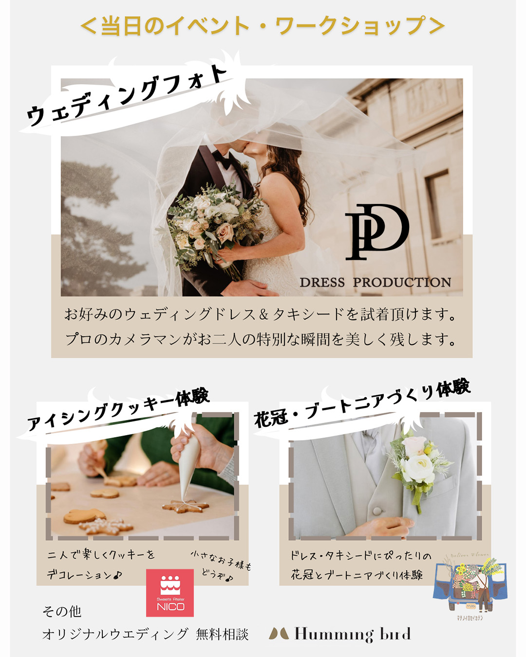 プロのカメラマンとヘアメイク付きのウェディングフォトお子様の記念撮影、 アイシングクッキーやお花のワークショップ、オリジナルウェディングや 2人の暮らし相談会が全て無料で体験できる、ウェディングと新生活に特化したスペシャルイベントを開催。