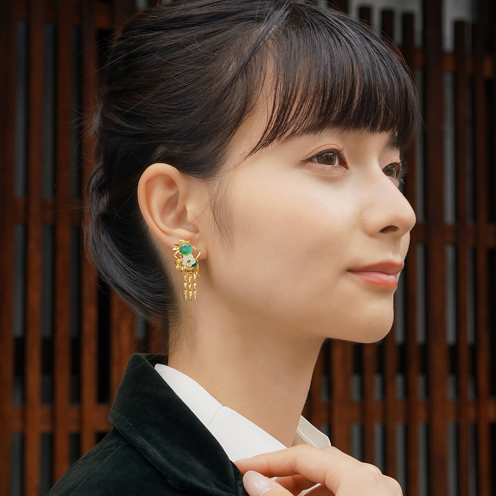 日本最古の物語「竹取物語」に登場するかぐや姫をモチーフにした、和の雰囲気ただよう華やかなデザイン。瑞々しい竹を感じさせる爽やかなグリーンのガラスが、きらめく竹のモチーフとともに印象的な耳元を演出します。サラサラと揺らめくチェーンは、風にそよぐ竹とかぐや姫の美しく長い髪をイメージしており、取り外しも可能な2WAY仕様です。華やかさと優美な雰囲気を宿す、物語の美しい情景を思わせるデザインです。