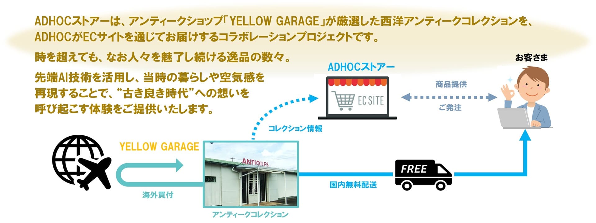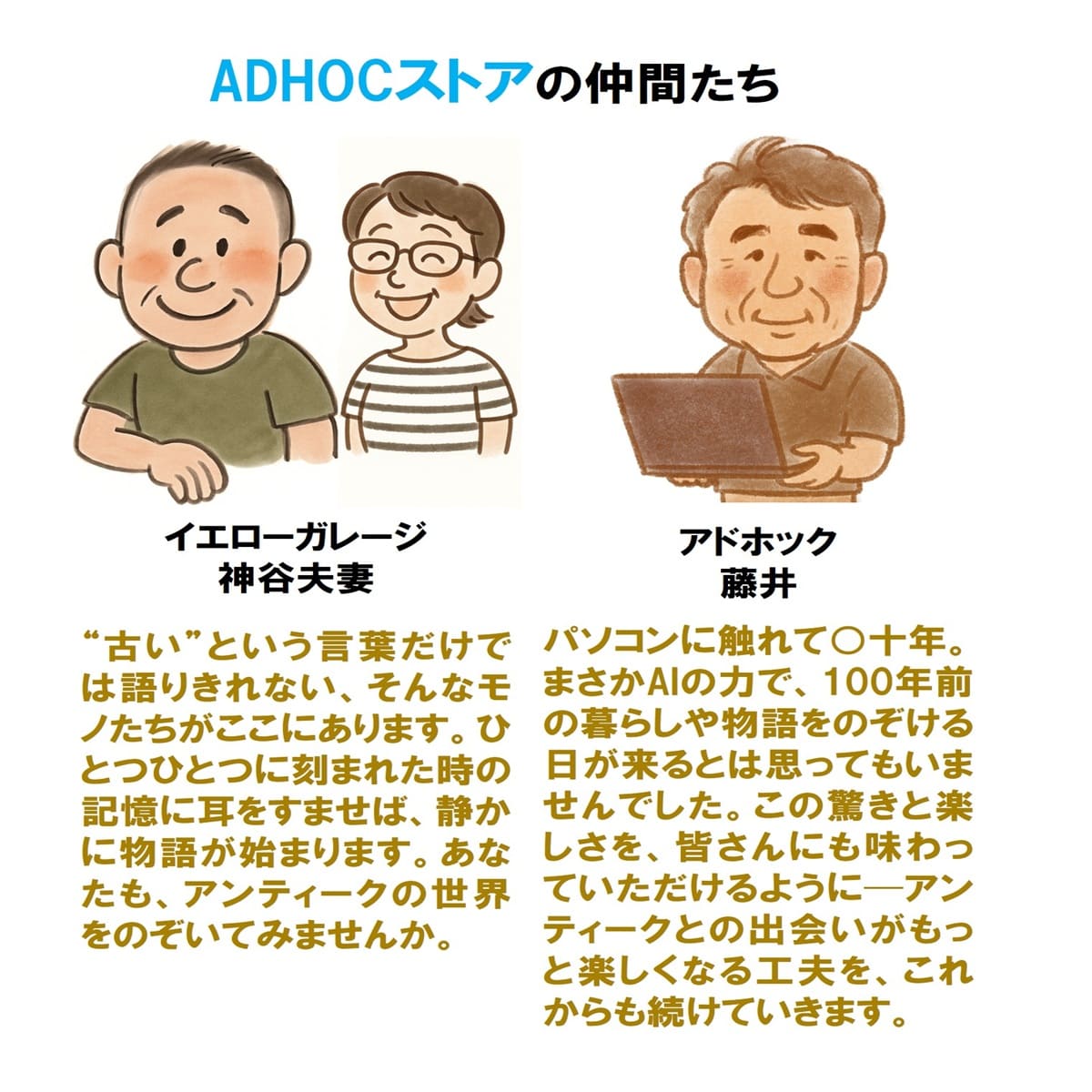 ADHOCストアは、愛知県知多半島・武豊町に実店舗を構える「イエローガレージ」と提携し、経験豊かなスタッフによって厳選されたアンティークアイテムを全国へお届けします。本ストアでは、商品一つひとつに詳細な写真(10点以上)とターンテーブル動画(360°回転映像)を用意し、オンラインでも安心して商品を選んでいただける工夫をしています。