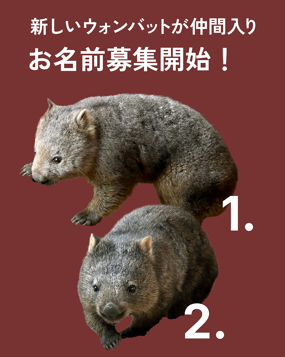 2頭に会える初めての機会となるイベント「ウォンバットだけの動物園」を開催いたします。このイベントは、2024年以降リニューアル工事を進めてきた五月山動物園の「ウォンバットエリア」の完成を記念したオープニングイベントとなります。