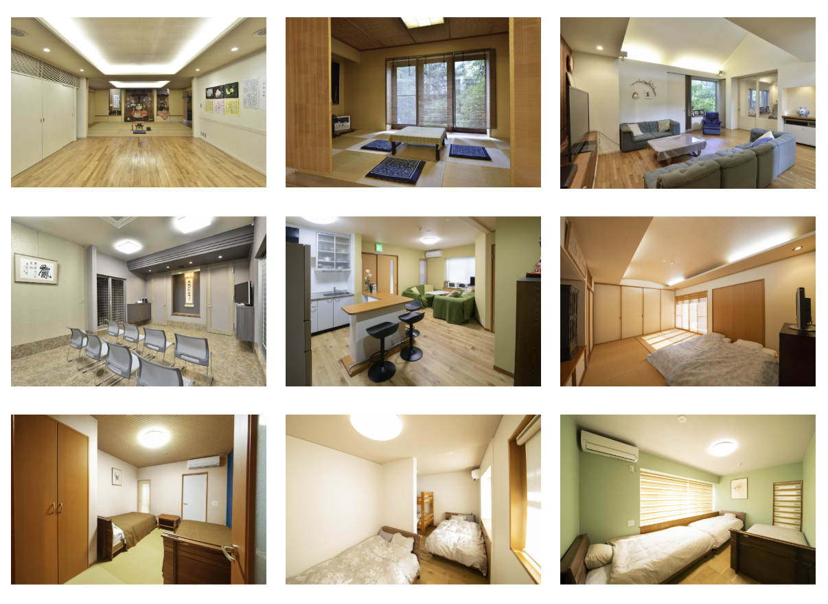 心泉会館には、本堂、瞑想や茶道体験に適した和室、開放的なリビング、セミナーなどに適したホールに加え、4つの個室とリビングキッチンからなる宿泊施設が含まれており、多様なプログラムや滞在スタイルに対応できる環境が整っています。