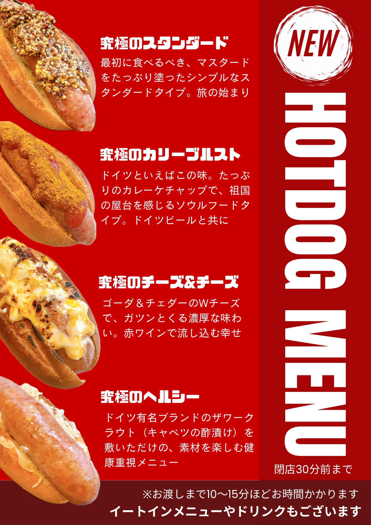 大人気の商品「本気のフランクフルトを贅沢に使用した4種類の〜究極のホットドッグ〜満を持して池下本店に登場。