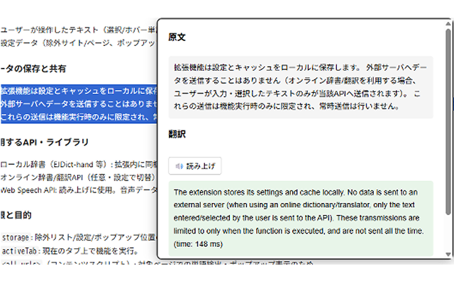 英語の勉強が続かないことで悩んでいましたが、辞書を引いたり発音を調べたりするために、別のタブを開かないといけないのが面倒くさいからではないか、という考えに至りました。 なので決められたページやサイトにおいて、単語へのマウスポインター+キー入力で単語の英和辞書引きや文章の翻訳、読み上げを出来るようにしました。 グーグルクロームの拡張機能ストアからダウンロードできます。 https://chromewebstore.google.com/detail/ghostdictionary/hhkabepkoliimdplcmfodncigbdcofil?authuser=0&hl=ja