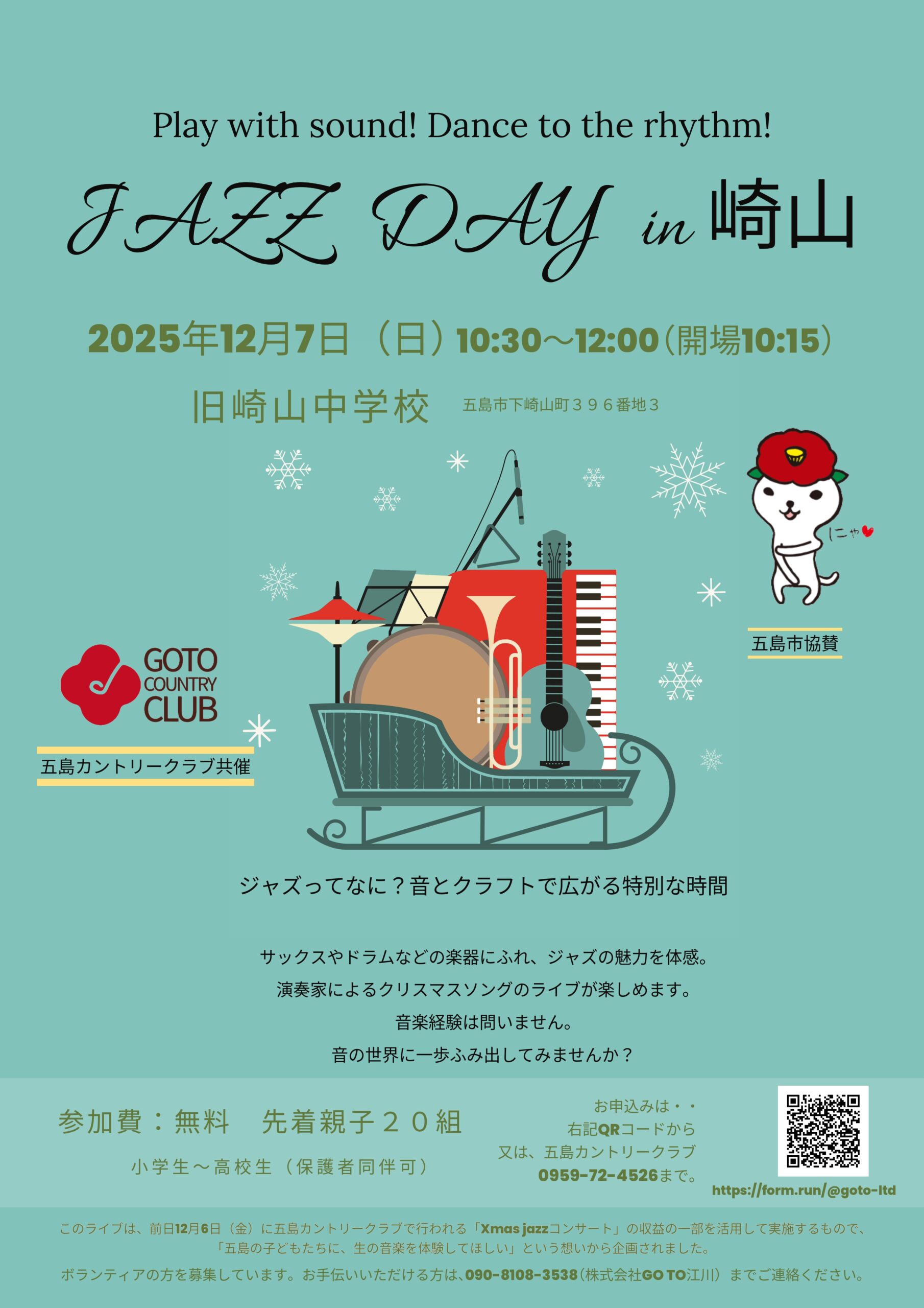 株式会社GOTOと五島カントリークラブは、地域貢献活動の一環として、五島市(協賛)の全面的な協力のもと、2024年3月に廃校となった旧崎山中学校音楽室を活用し、2025年12月7日(日)に子ども向け無料ジャズライブを開催いたします。