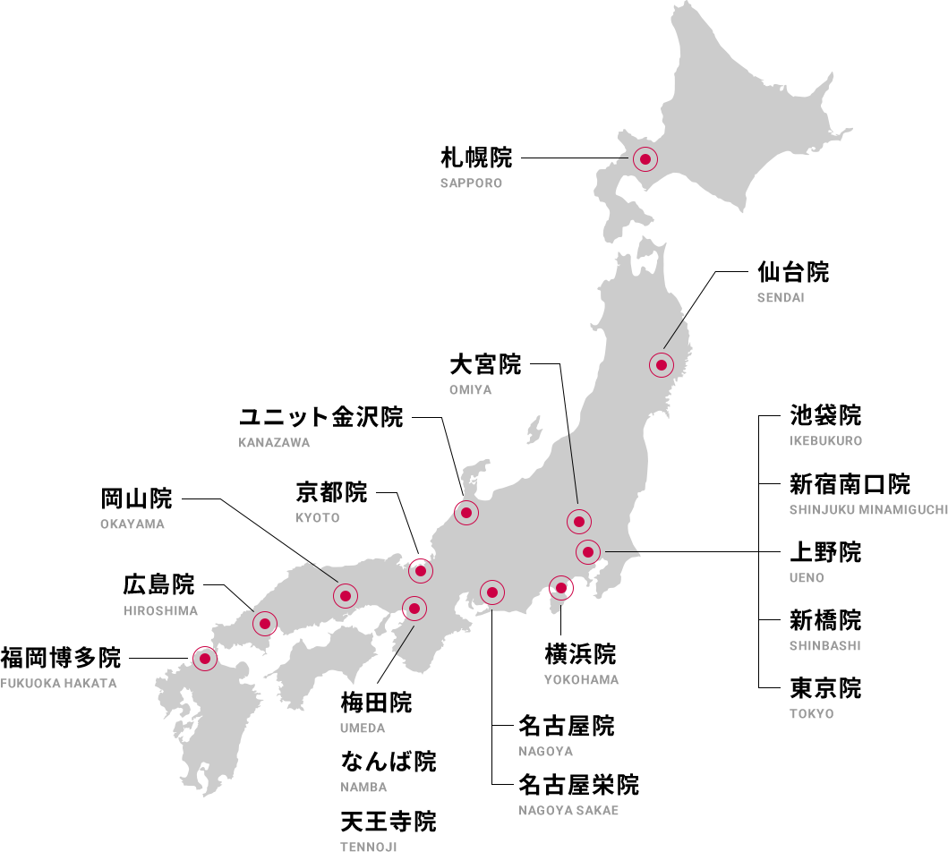 当グループは提携院を含め、北海道(札幌)、東北(宮城・仙台)、関東(東京、埼玉、神奈川)、北陸(金沢)、中部(名古屋、栄)、関西(大阪、京都)、中国(広島、岡山)、九州(福岡・博多)と全国に19院展開しております。