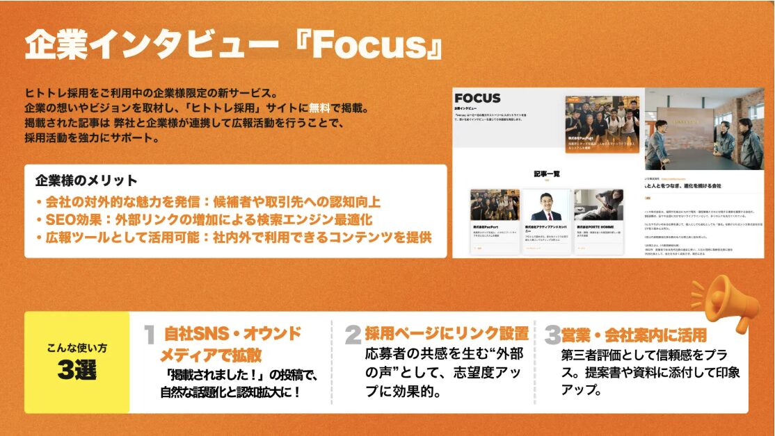 採用広報メディア「Focus」 期間限定で無料掲載、採用広報を“資産化”。『ヒトトレ採用』導入170社突破を機に掲載エントリー受付中
