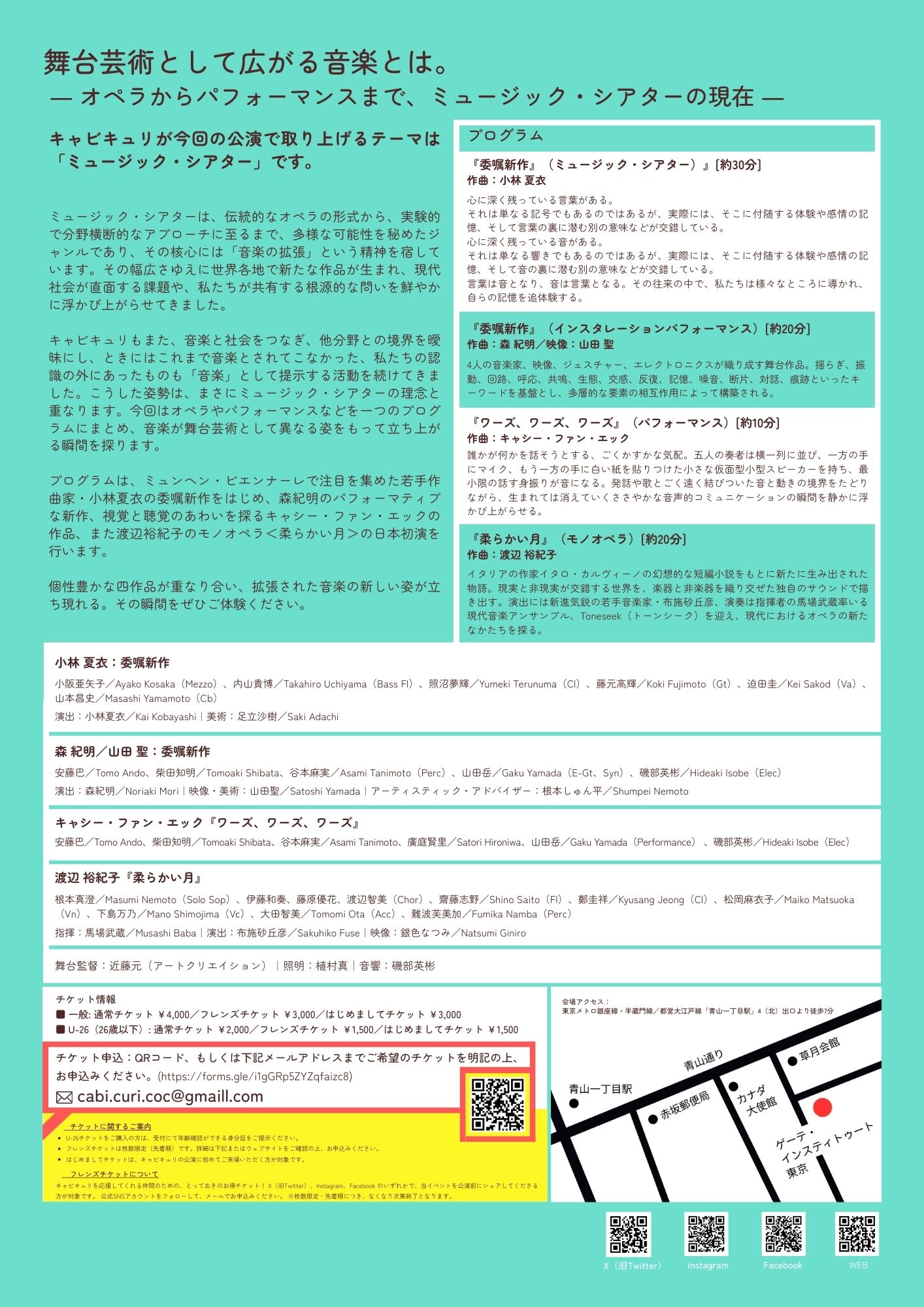 ミュージック・シアターは、伝統的なオペラの形式から、実験的で分野横断的なアプローチに至るまで、多様な可能性を秘めたジャンルです。このたびは、日本から発信するミュージックシアターの新しいカタチをみなさまと共有すべく、全日本初演四作を若手音楽家の演奏・パフォーマンスによってお届けします。