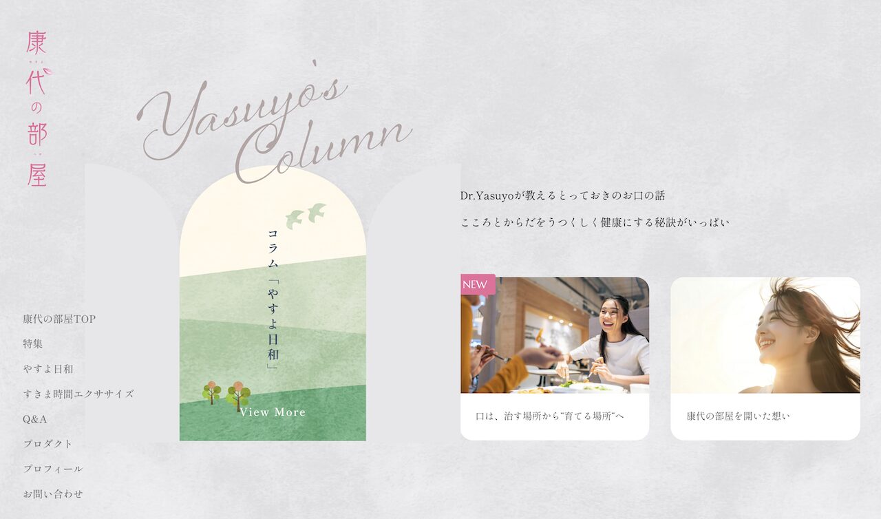 そうした経験をもとに、「お口からはじまるセルフケア文化」をより多くの方に広げる場として、「康代の部屋」を立ち上げました。不安や変化の多い時代だからこそ、本サイトの発信により、心と体を自分で整え、笑顔で生きられる社会づくりを目指しています。