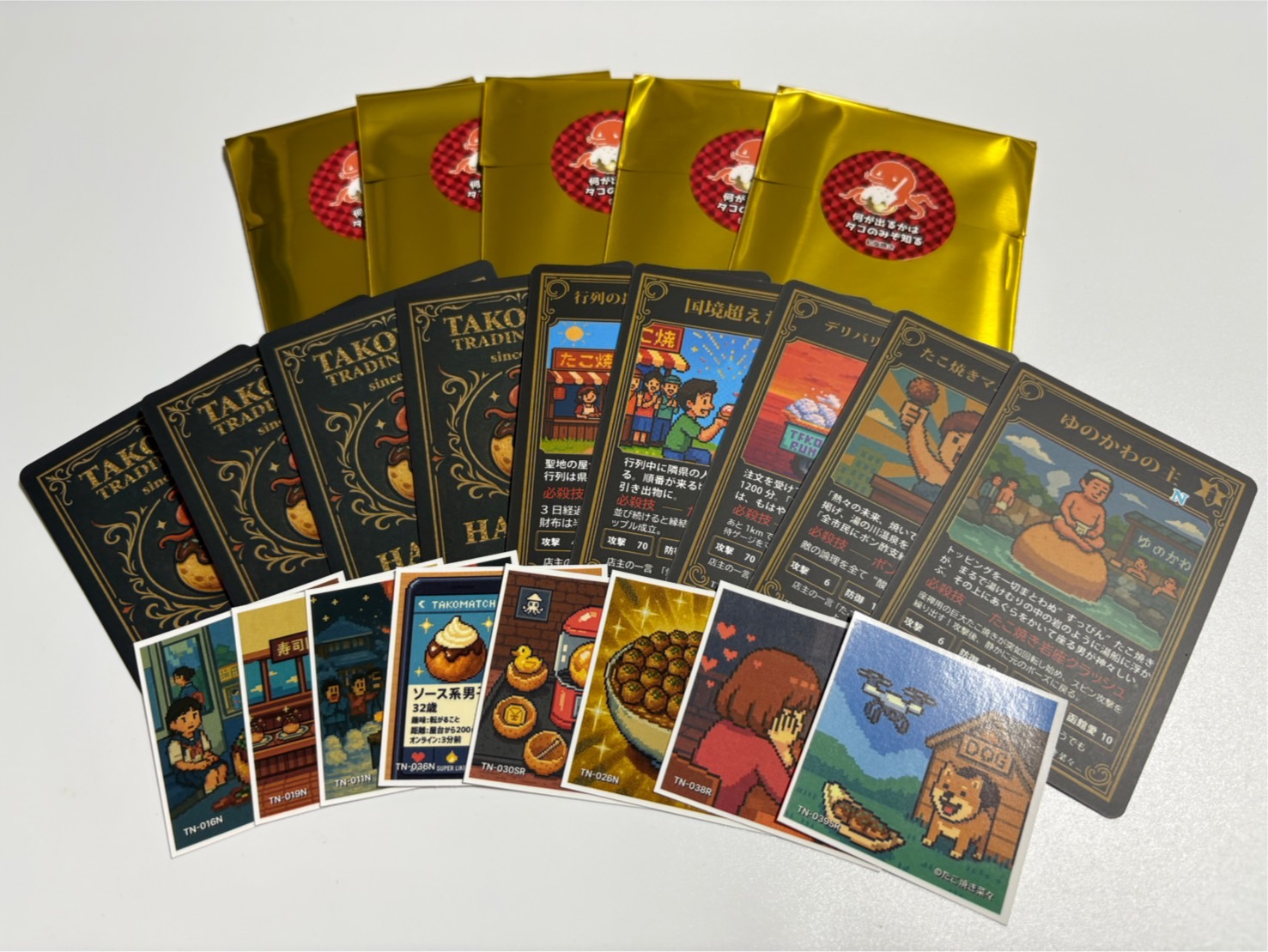 『たこ焼きトレーディングカード』は、原材料高騰の中でも値上げを避けたいという思いから誕生した個人プロジェクトです。店主が企画・デザイン・イラスト・コピー制作・印刷手配・SNS運用まで全工程を1人で担当。ギャグ、社会風刺、ピクセルアート、函館のローカル文化を融合した独自の世界観がSNSで話題となり、全国から通販注文が寄せられています。