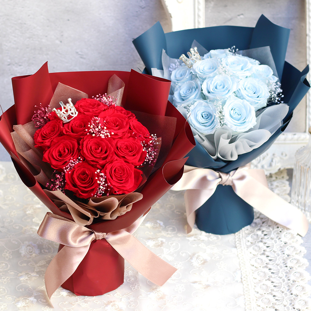 12本のバラ(1ダースローズ)でプロポーズ!プロポーズに定番人気のバラの花束をプリザーブドフラワーでご用意しました。人気の12本のバラの花束にかわいいクラウン(王冠)のモチーフをあしらった花束です。人気の赤と、淡いブルーの2種類をご用意しております。いつまでも楽しんでいただけるよう、自立してアレンジメントのように飾れるように作った当店特製のプリザーブドフラワーブーケ。インテリアとして、いつまでも幸せな気持ちを思い出せる特別な花束です。「私の愛は枯れることはありません」のメッセージと共に、愛する人にお贈りしませんか?