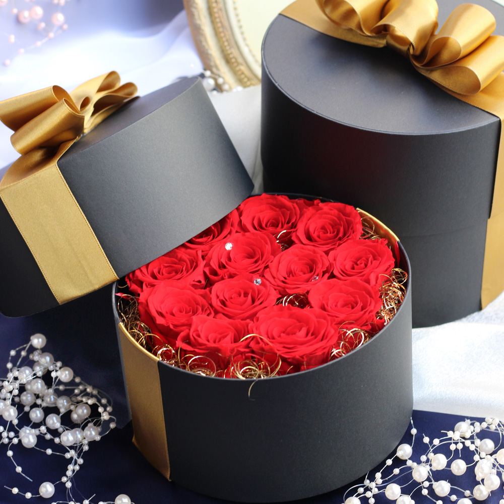 プロポーズに人気のダズンローズ(12本のバラ)が、ロマンチックなボックスフラワーになりました。プロポーズにはもちろんお二人の記念日、お誕生日、クリスマスプレゼントにもぴったりなシンプルで高級感あるバラのフラワーBOXです。こちらのBOXは透明のカバー付きなので飾っていても埃がかぶらず、湿気の影響も受けにくく、もらった後も長く美しい状態を保てます。また、マグネットが内蔵されているのでふたを回して本体にピタッとくっつけることができ、スタイリッシュに飾って頂けるところも嬉しいポイント。