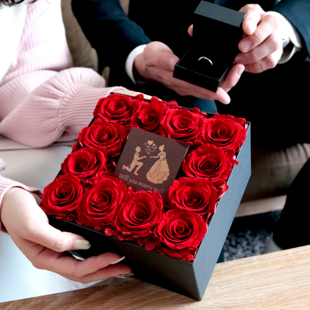 プロポーズに人気の1ダースローズ(12本のバラ)が、ロマンチックなボックスフラワーになりました。箱を開けると真っ赤なバラのプリザーブドフラワーと、「Will you marry me ? (私と結婚してください)」のメッセージ!プロポーズプレートは当店オリジナルデザインです。「ジュエリーケース有り」のデザインは、真ん中にジュエリーケースが隠れているので、中に指輪やアクセサリーを入れて、サプライズプレゼントにもぴったり。「ジュエリーケース無し」のデザインは、プレートを外すと高級感があふれる、キラリと光る幾何学模様が現れます!ご用途に応じて、お好きなデザインをお選びください。