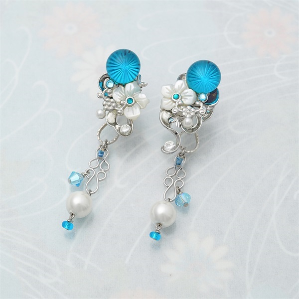 日本の昔話「浦島太郎」をモチーフに、海の中で出会った幻想的な世界を描いたデザインです。海の底を感じさせる澄んだブルーのガラスに、乙姫の髪飾りをイメージした白いシェルの花が寄り添うデザイン。やわらかな波型を描くようなモチーフは、海の揺らぎや乙姫が身に付けるフワフワとした羽衣を思わせます。透け感のあるチェーンは海の中で光る泡を表現しており、貝の中に潜む真珠を表現した大粒パールが上品な輝きを添えます。