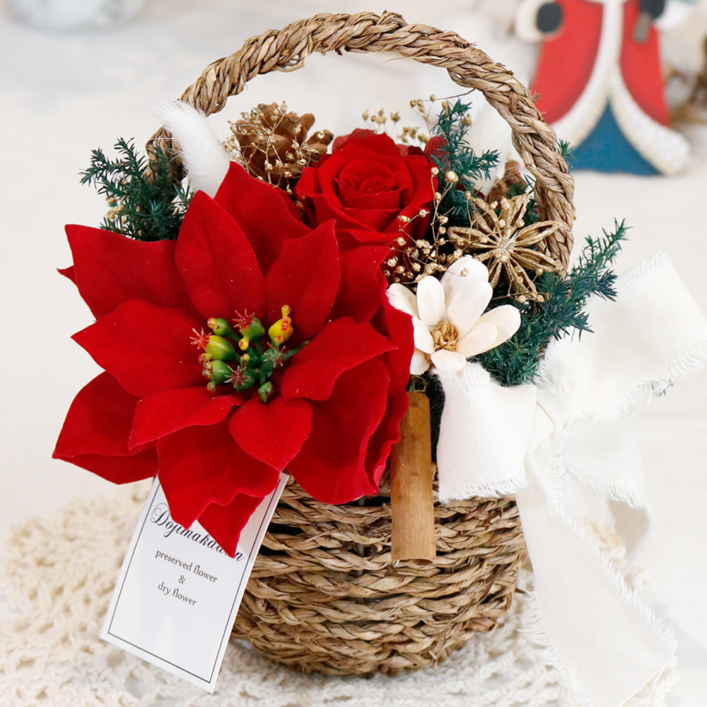 “聖なる夜の花”と呼ばれるポインセチアを主役にした、クリスマスらしさあふれるアレンジです。アーティフィシャルフラワーで作られているため手入れが不要で、長く美しさを保つことができます。大切な人への季節の贈り物として好評です。