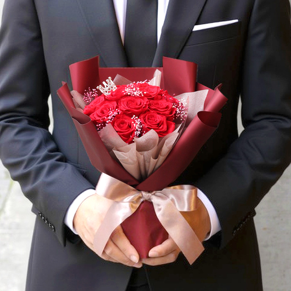 プロポーズの定番として人気の“12本のバラ(1ダースローズ)”をプリザーブドフラワーで仕立てた花束です。赤と淡いブルーの2色を展開し、かわいいクラウン(王冠)のモチーフをあしらった華やかなデザインが特徴です。インテリアとしてそのまま飾れる自立型アレンジで、「私の愛は枯れることはありません」という想いを象徴するギフトです。