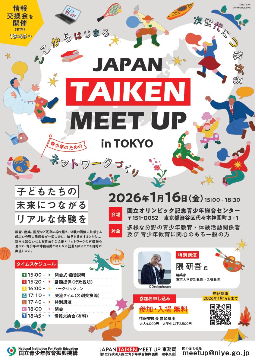 国立青少年教育振興機構(東京都渋谷区、理事長:古川和)では、この度、教育、産業、医療など既存の枠を超え、体験の価値に共感する幅広い分野の関係者が一堂に会し、知見を共有するとともに、新たな出会いによる前向きな協働やネットワークの再構築を通じて、青少年の体験活動のさらなる促進を図ることを目的に全国5都市でイベント「JAPAN TAIKEN MEET UP」を開催します。