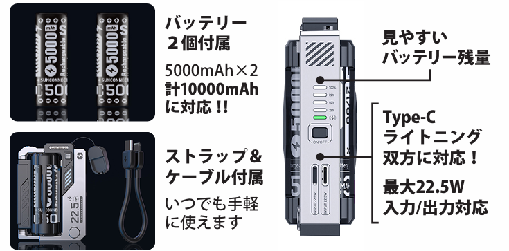 5000mAhのバッテリー2個付属で、合計最大10,000mAhの容量に対応しています。