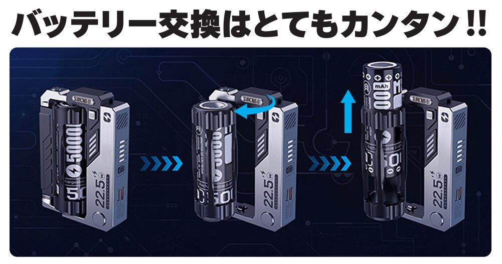 電池の交換ができるモバイルバッテリーです。バッテリー2個付属で、合計最大10,000mAhの容量に対応しています。ストラップとケーブルも付属しており、旅行や出張など、どこへでも手軽に持ち運べます。最大22.5Wの入出力に対応し、効率的な充電が可能。さらに、バッテリー残量を確認できる機能も備えており、使いやすさと安心感を両立したモバイルバッテリーです。