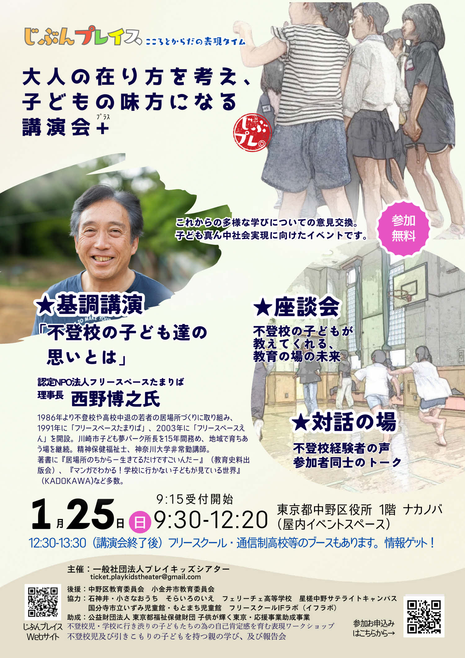 2026年1月25日(日)中野区役所1階ナカノバにて講演会を開催します。不登校や登校しぶりの子どもたちの思いに触れる、表現ワークショップ「じぶんプレイス」の実践を通して育まれた自己肯定感や、多様な学びの可能性について考えます。基調講演には、認定NPO法人フリースペースたまりば 理事長・西野博之氏を迎え、子どもたちの思いに寄り添う教育のあり方を探ります。行政と民間が連携して不登校支援に取り組みます。