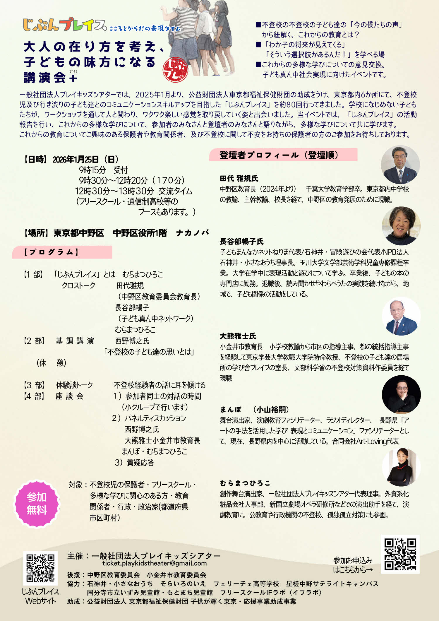 ※じぶんプレイス開催地である中野区・小金井市の教育長が登壇し、行政と民間が連携して不登校支援に取り組む姿勢を示す貴重な機会です。また、不登校経験者、フリースクール関係者、教育行政、演劇教育の専門家など、異なる視点が交差することで、子どもたちの“今”を多角的に捉える場となります。