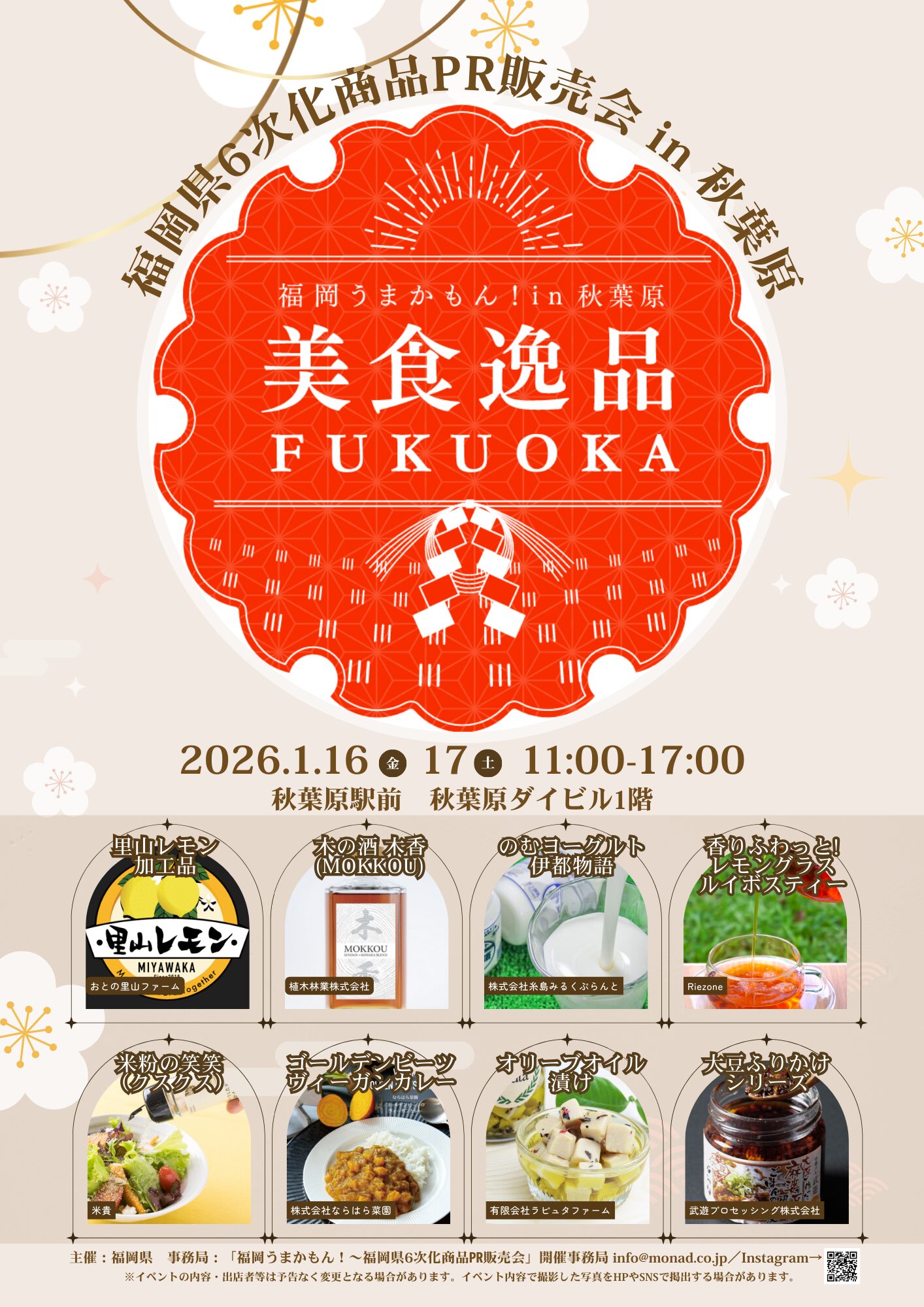福岡の魅力が詰まった6次化商品を購入できるイベント「福岡うまかもん!~福岡県6次化商品㏚販売会~in 秋葉原」を2026年1月16日~17日に東京都・秋葉原ダイビル エントランス前にて開催います。
