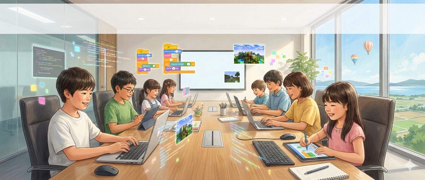 ScratchやMinecraft、生成AIなどを使った自由な制作を通じて、子どもたちは自分のアイデアを形にする楽しさに出会います。