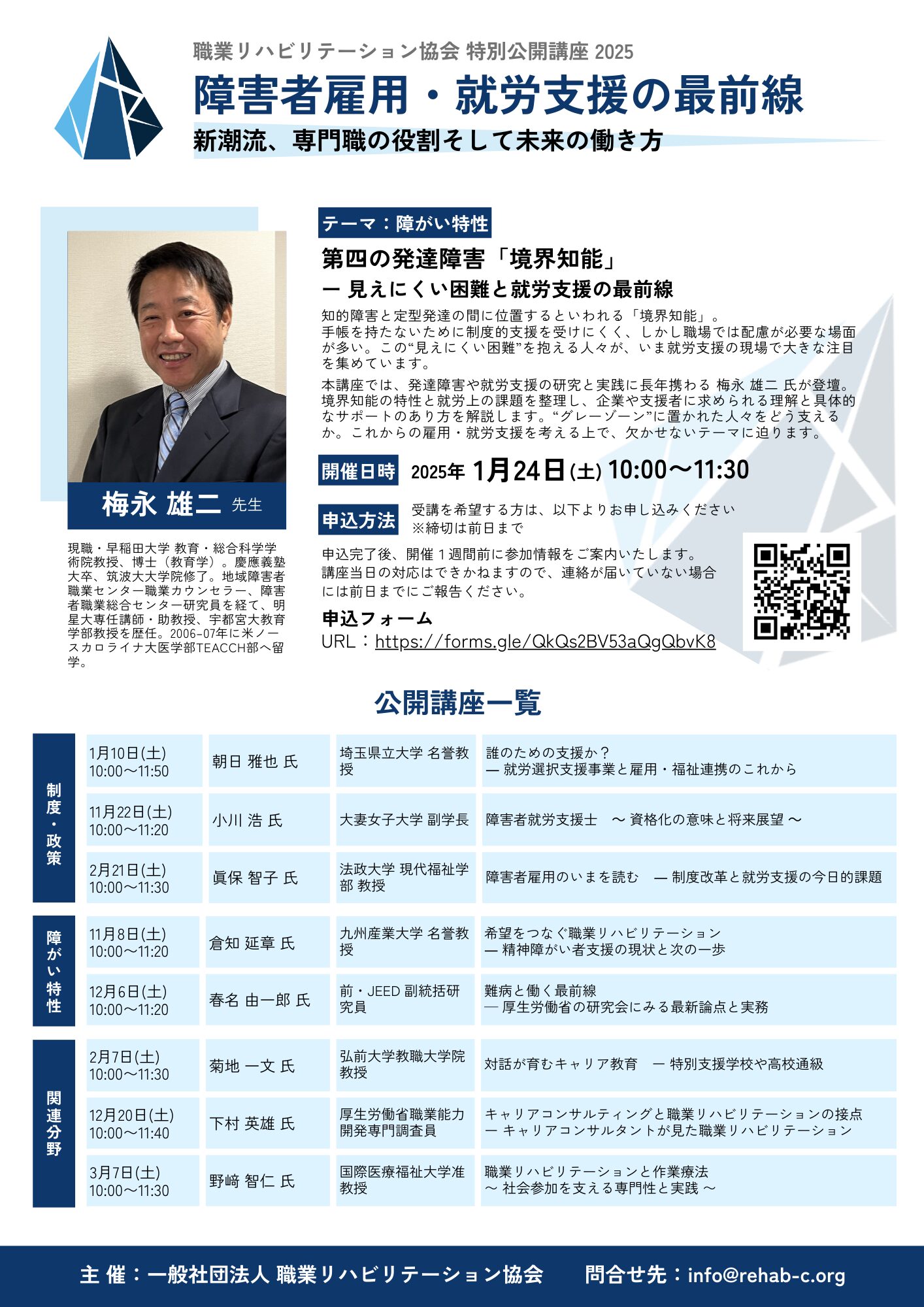 本講座では、発達障害や就労支援の研究と実践に長年携わる梅永 雄二 氏が登壇し、境界知能の特性と就労上の課題、企業や支援者に求められる理解と具体的なサポートのあり方を解説します。質疑応答では参加者の疑問を共有し、実践に役立つヒントを深掘りします。