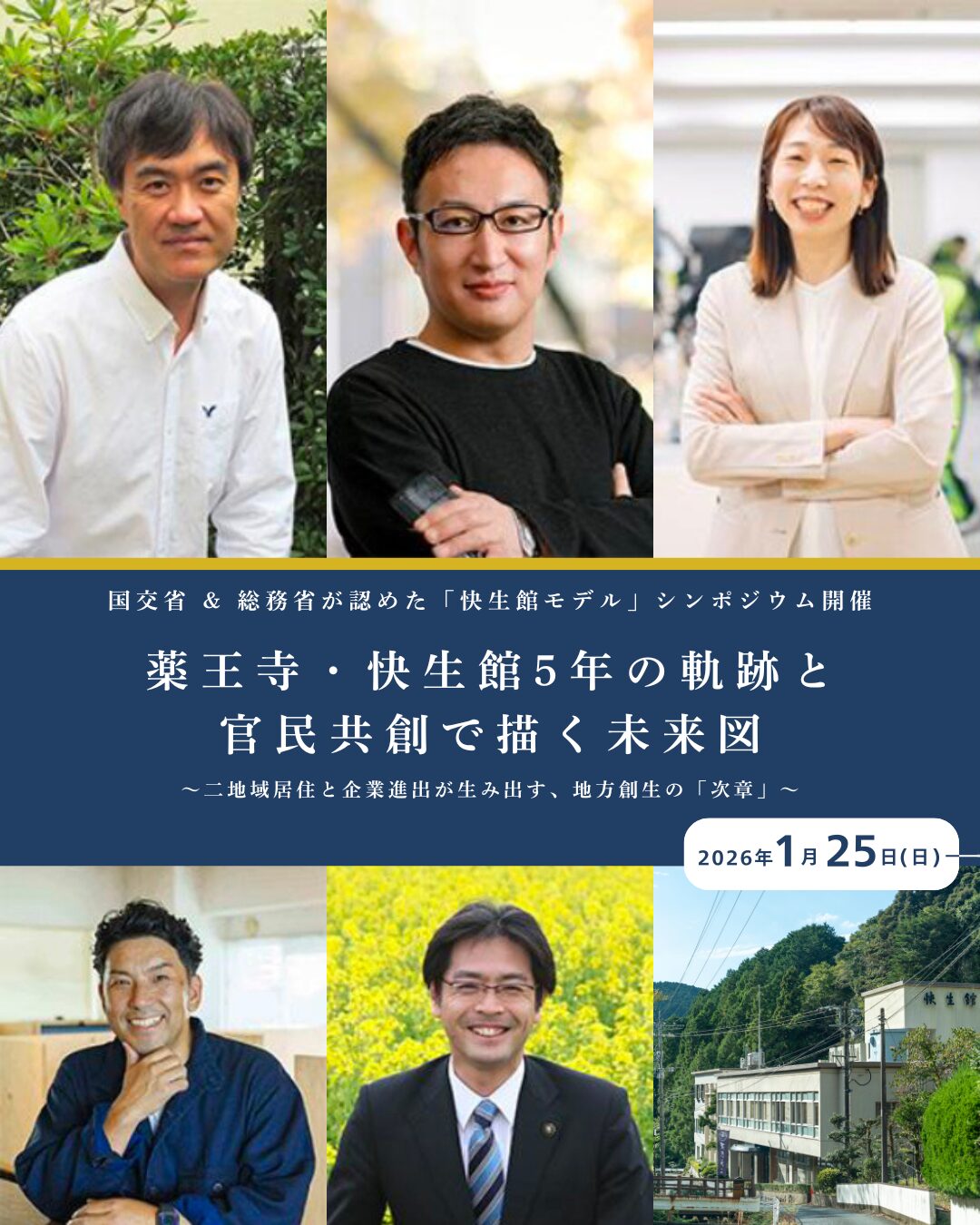 このダブル受賞とリニューアル5周年を記念し、2026年1月25日(日)に「快生館シンポジウム」を開催します。テーマは「薬王寺・快生館5年の軌跡と官民共創で描く未来図」です。当日は、ANAホールディングス未来創造室長の津田佳明氏や、福岡地域戦略推進協議会(FDC)事務局長の石丸修平氏ら、地方創生の最前線を走るキーマンが古賀市に集結します。IT企業(株式会社Asian Bridge)による進出事例発表や、田辺一城古賀市長、株式会社SALT須賀代表を交えたパネルディスカッションを実施。行政・交通・民間運営の多角的な視点から、国が認めた「二地域居住」や「官民連携」の成果を紐解き、次なる地方創生の未来戦略について熱い議論を展開します。