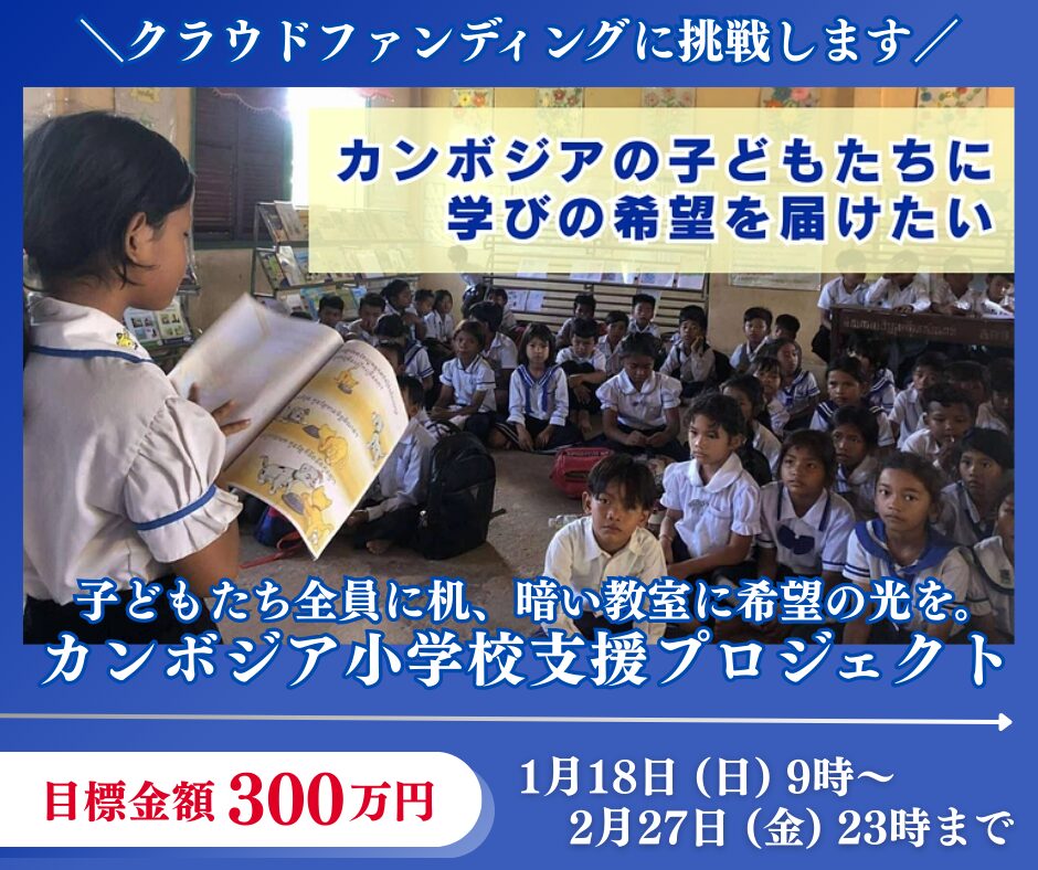 一般財団法人日本先端技術国際インフラ協力機構(所在地:神奈川県、代表理事:柏野 宏之、以下「JATIC」)は、クラウドファンディングサービス「READYFOR」にて、カンボジアの首都プノンペン近郊の農村の小学校「モンクル・ボレイ小学校」を支援するために「子どもたち全員に机、暗い教室に希望の光を。カンボジア小学校支援」を公開しました。300万円を目標に、本日2026年1月18日(日)から2026年2月27日(金)まで支援を募ります。