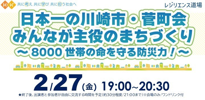 この度、レジリエンスプログラムの一環として『日本一の川崎市・菅町会、みんなが主役のまちづくり~8000世帯の命を守る防災力!~』を開催いたします。