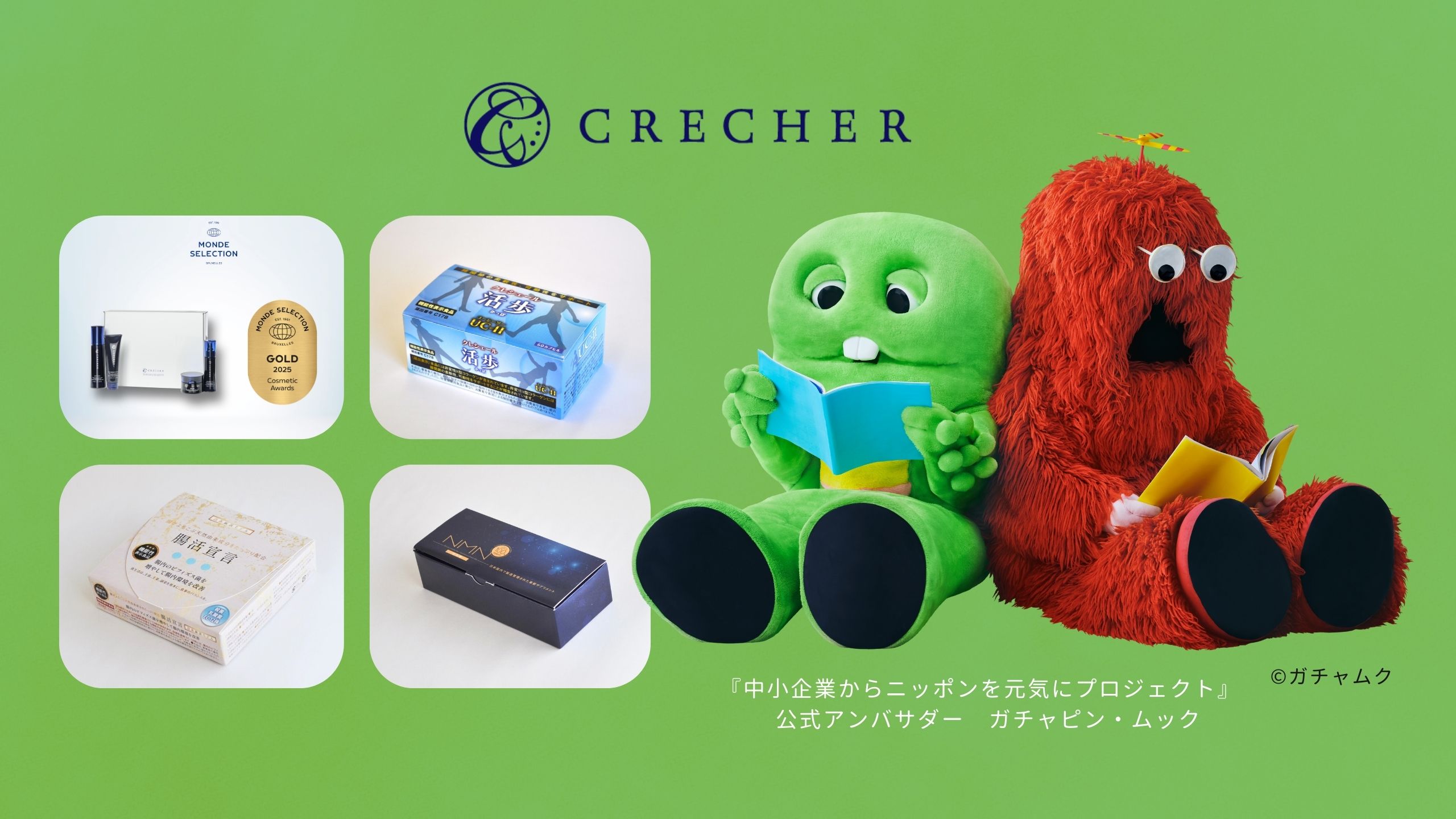 ガチャピン・ムックが公式アンバサダーを務める『中小企業からニッポンを元気にプロジェクト』に参画し、『クレシェールローション・腸活宣言・NMN』3商品のプロモーションを開始しました【クレシェール化粧品】