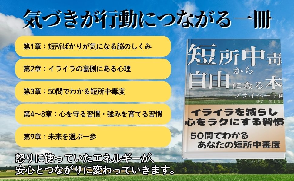 NK総研(代表:瀬川裕之)は、短所に過度に意識が向いてしまう心理習慣「短所中毒」をテーマにした書籍シリーズの第3弾となる新刊『短所中毒から自由になる本(プライベート編)~ イライラを減らし、心をラクにする習慣 ~』を発売しました。