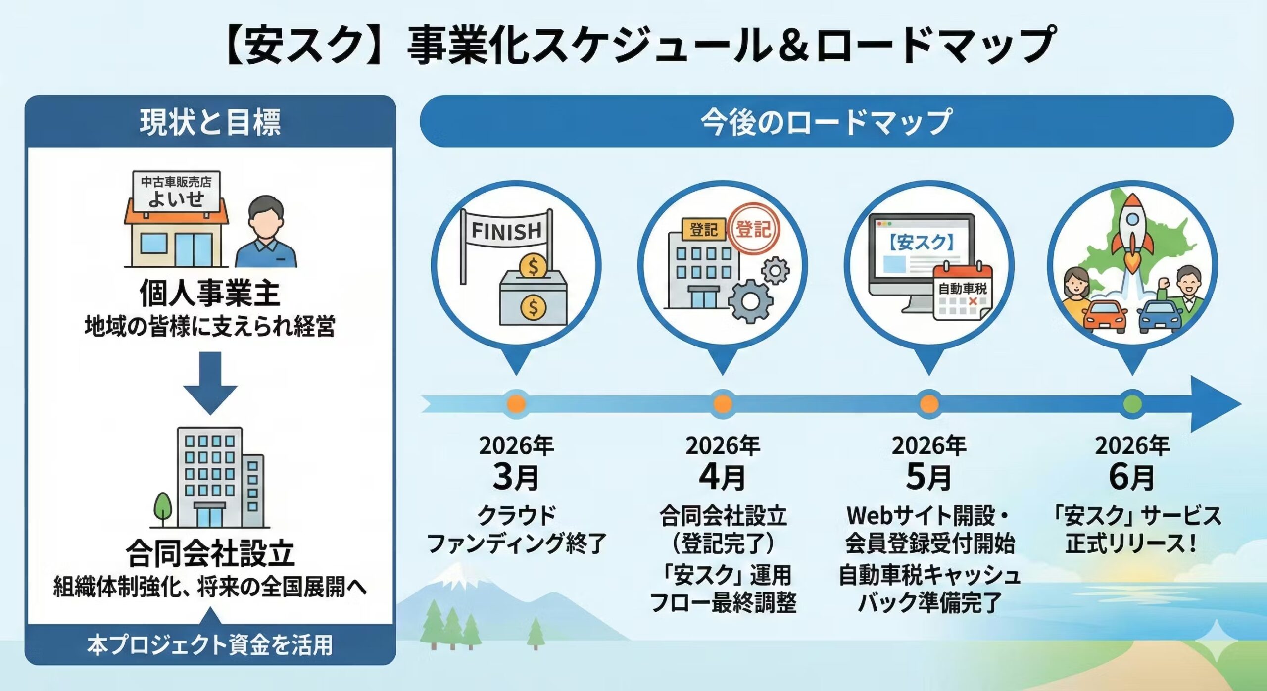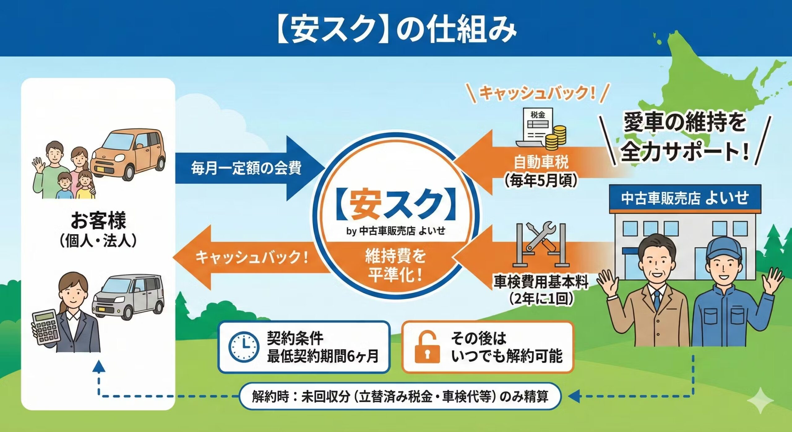 北海道石狩市で地域密着型の中古車販売店を営む「よいせ」(代表:兼近 峻史)は、現在乗っている愛車の維持費を平準化し、サブスクリプションサービスとして提供する日本初のサービス「安スク」を立ち上げます 。本サービスの提供開始に向けた基盤構築のため、2026年1月よりクラウドファンディングサイト「CAMPFIRE」にてプロジェクトを開始いたしました。