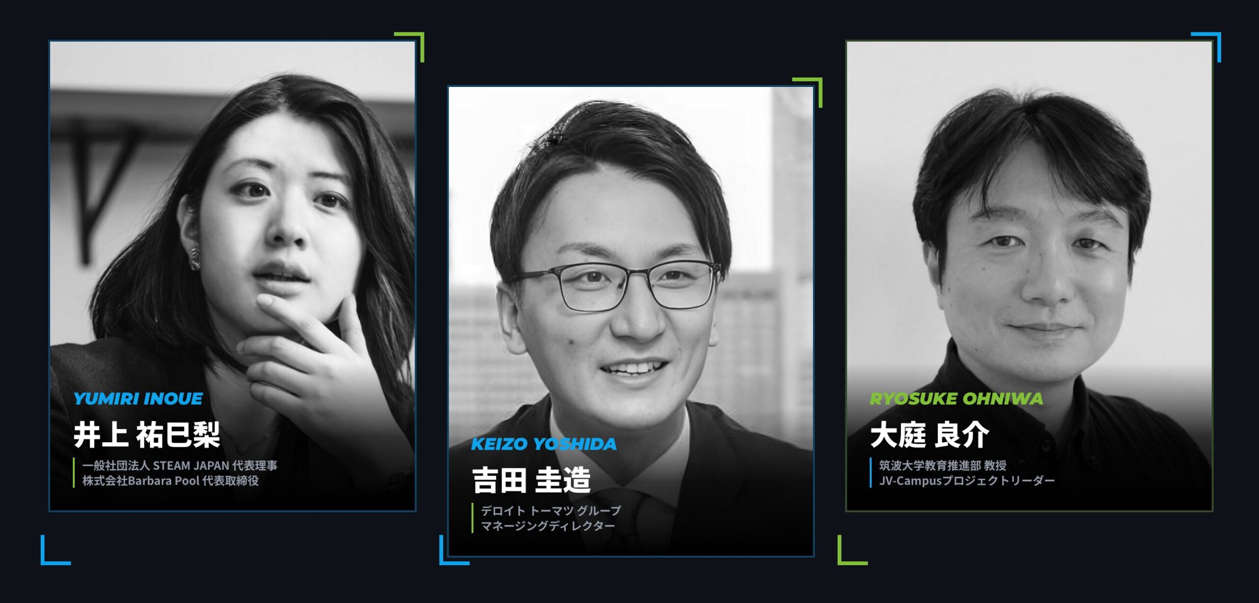 豪華登壇者による「教育×ビジネス」クロストーク 日本のSTEAM教育を牽引し、メディアでも注目を集める井上祐巳梨氏(STEAM JAPAN代表)、ビジネス変革の最前線に立つ吉田圭造氏(デロイト トーマツ グループ)、そして国際的な教育プラットフォームを推進する大庭良介氏(筑波大学/JV-Campus)が登壇。 「AI時代における人間の役割」「事業変革と社会的価値の両立」といったテーマに対し、綺麗事ではない、現場のリアルな視点を交えた熱い議論を交わします。