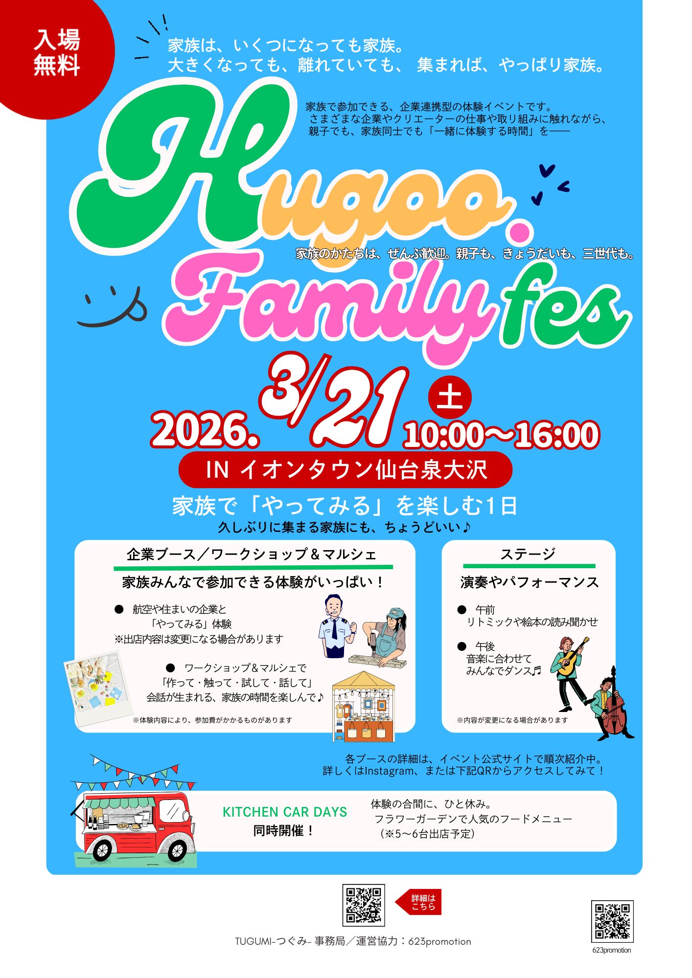 2026年3月21日(土)、イオンタウン仙台泉大沢にて、体験型ファミリーイベント「Hugoo Family Fes」を開催します。いくつになっても親でも子でもいられる親子のつながりをテーマに、親・子・孫が世代を越えて一緒に遊び、笑い、体験する1日。大人が思いきりはしゃぎ、子どもと同じ目線で楽しむ時間を通して、家族の“今”をぎゅっと感じられる、ワクワクが詰まったイベントです。