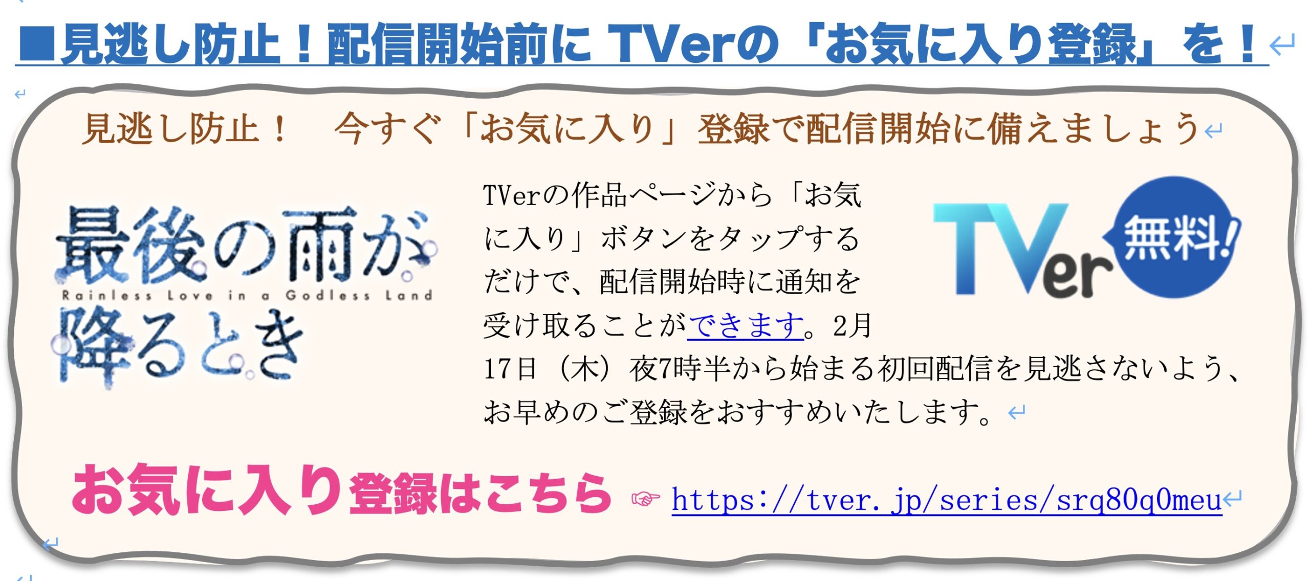 TVerの作品ページから「お気に入り」ボタンをタップするだけで、配信開始時に通知を受け取ることができます。2月17日(木)夜7時半から始まる初回配信を見逃さないよう、お早めのご登録をおすすめいたします。