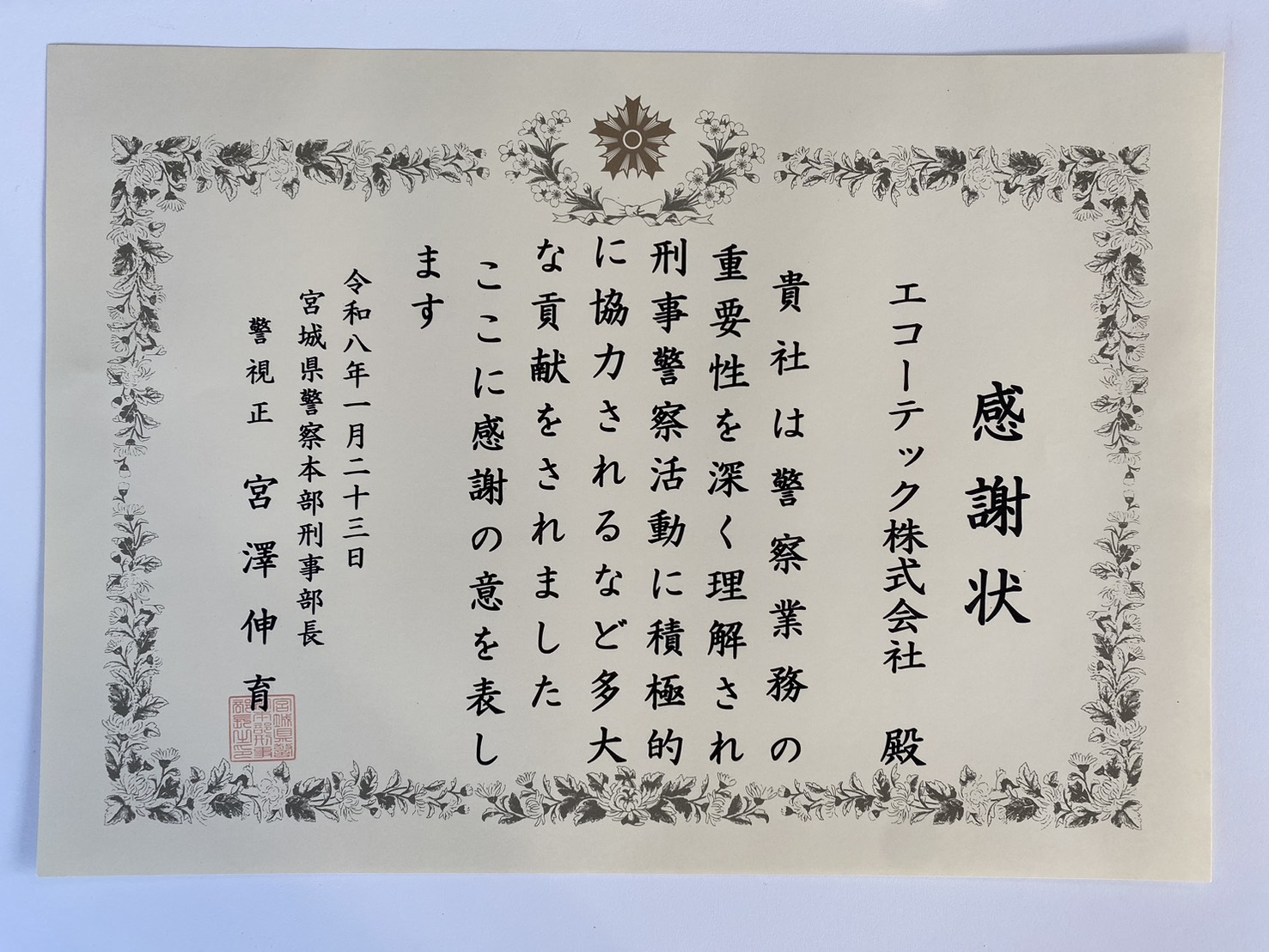 エコーテック株式会社(本社:愛知県豊橋市、代表取締役:岩崎 義弘、以下、エコーテック)は、2026(令和8)年1月23日(金)、宮城県内で発生した刑事事件の捜査活動への協力が評価され、宮城県警察本部(以下、宮城県警)より感謝状を授与されました。