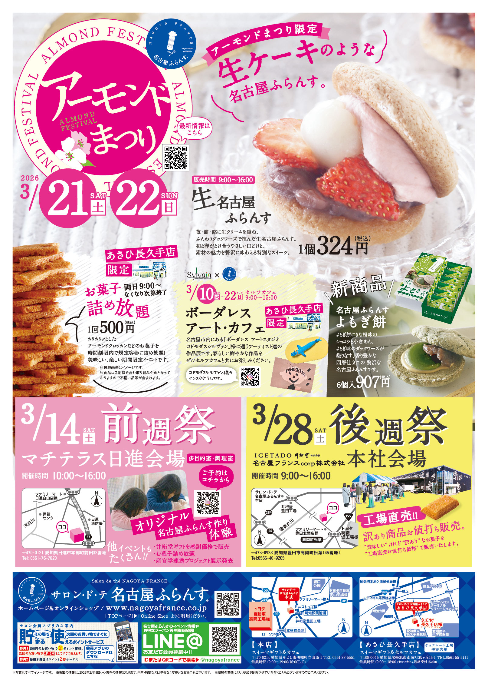 日ごろの感謝を込めて、2026年は「前週祭」と「本祭」「分祭」として、初開催となる道の駅「マチテラス日進」、名古屋ふらんす直営店2店舗、井桁堂本社の4か所を会場とし、3週連続で実施します。