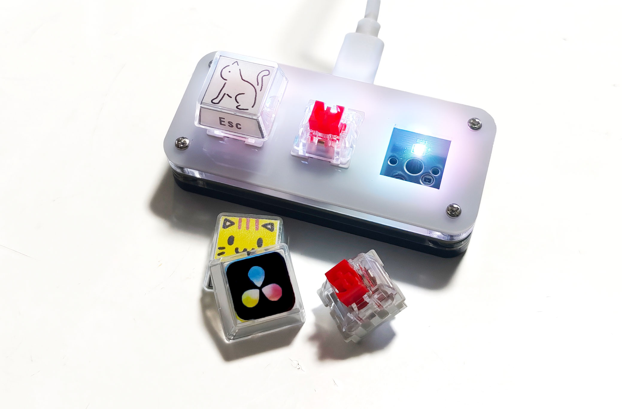 キーキャップ・キースイッチ(Cherry MX互換)を自由に交換可能。付属の二重構造キーキャップには好みの台紙を挿入して視覚的にカスタマイズできます(テンプレート無料提供)。