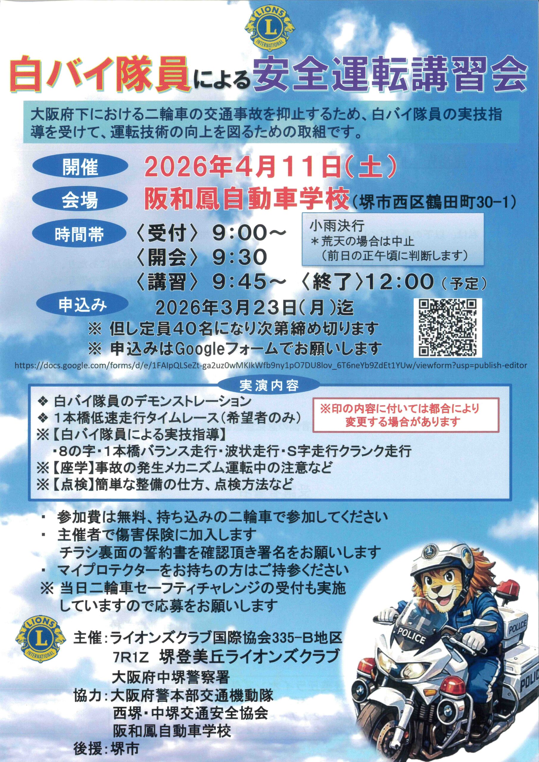 楽しいバイクライフを長く続けるために、最も大切なのは「無事に帰ること」です。講習会の後半では、交通安全の最前線に立つ中堺警察署と協力し、事故発生のメカニズムをわかりやすく紐解く座学プログラムを実施します 。データに基づいた「事故が起きやすいシチュエーション」を知ることで、危険を予測する力を養い、事故を未然に防ぐためのプロの心得を学びます 。さらに、愛車のポテンシャルを維持するための「日常点検レクチャー」も実施 。複雑な工具を使わなくても、自分の目と手で確認できる整備のコツを伝授します。タイヤの状態やブレーキの効き具合など、プロが実践しているチェックポイントを知ることは、走行中のトラブル防止に直結します 。主催の堺登美丘ライオンズクラブと各協力団体が目指すのは、単なる知識の提供ではありません 。この講習会を通じて、ライダー一人ひとりが「自分の安全は自分で作る」という自信を持ち、地域全体で事故ゼロを目指すきっかけとなることです。4月11日、堺の地で、より安全でより楽しいバイクライフへの第一歩を一緒に踏み出しましょう 。