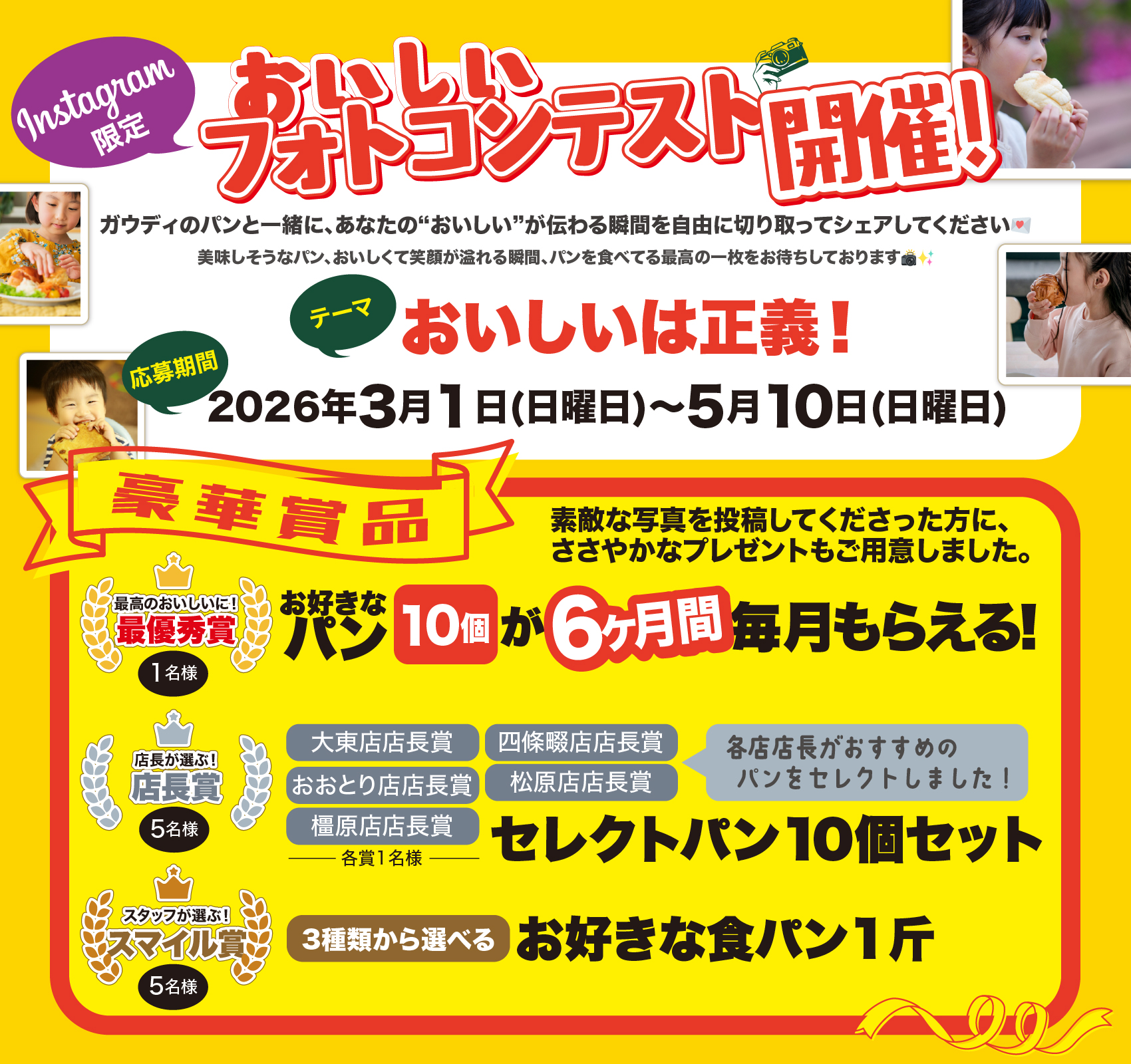 コンテスト最優秀賞には6ヶ月間お好きなパンが10個、毎月もらえるチケットプレゼント!