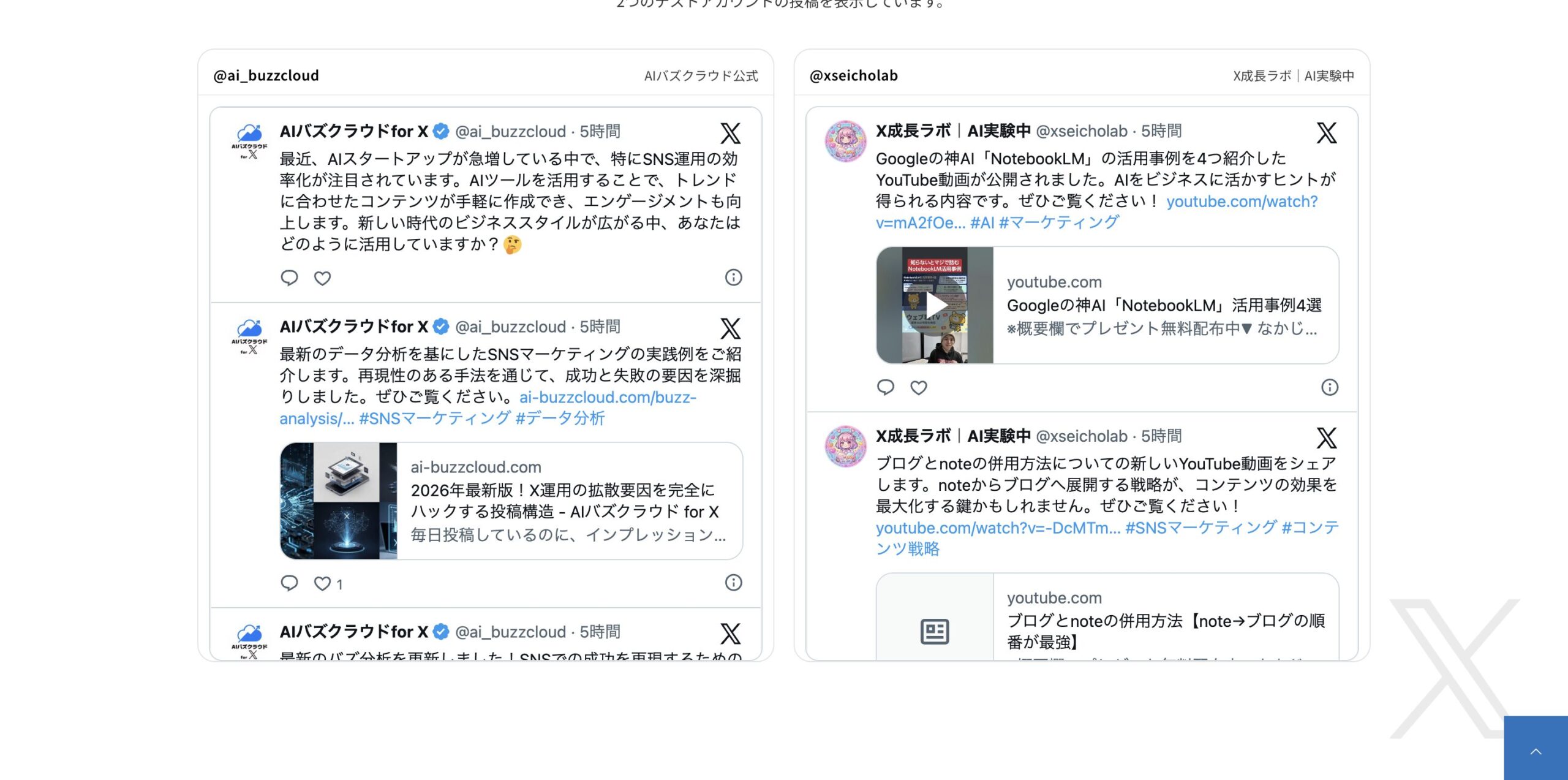 これらの機能により、AIバズクラウド for Xは「投稿を増やすツール」ではなく、「成果を見据えて設計された投稿を継続的に届けるための仕組み」として機能します。日々の作業負担を軽減しながら、戦略的で一貫性のある発信を実現することで、X運用を再現性のある成長エンジンへと進化させます。